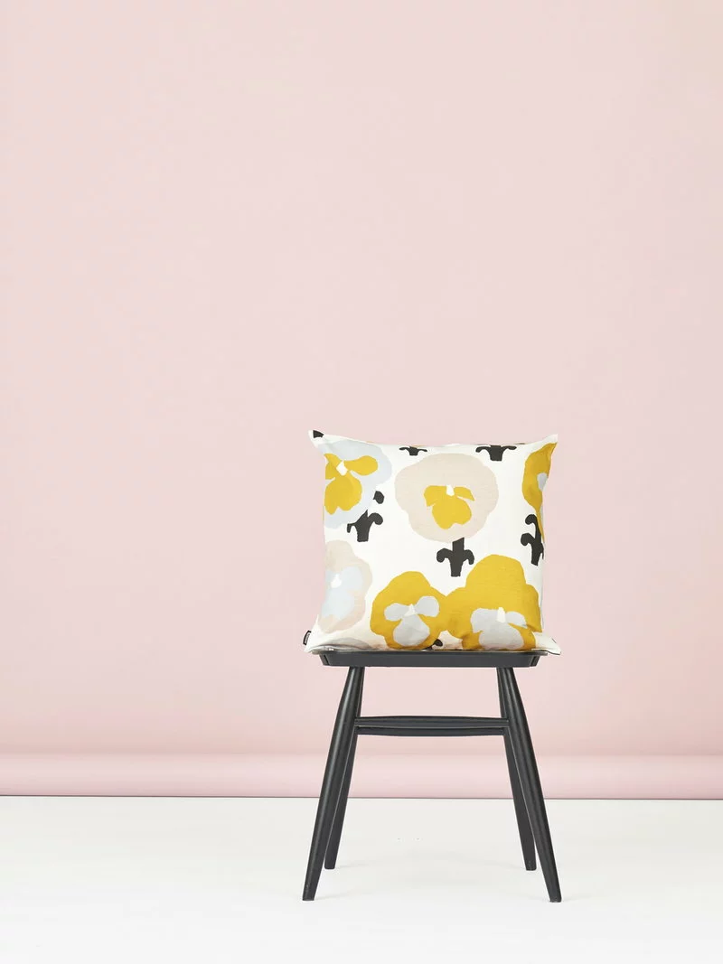 La fodera per cuscino Orvokki di Kauniste è decorata da un particolare del motivo floreale di Hannele Äijälä con grandi viole. La fodera per cuscino Orvokki (parola finlandese che significa viola) è realizzata in misto lino e cotone ed ha una chiusura lampo nascosta su un lato. Ideale per cuscini interni della misura di 50 cm x 50 cm.