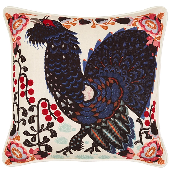 La fodera per cuscino Grouse in the woods di Klaus Haapaniemi rappresenta un bell’esemplare maschio di fagiano con piume nei colori nero, blu e marrone. Lo sfondo è decorato da motivi floreali e bacche rosse. La fodera è realizzata in misto cotone e lino e il motivo è stampato su entrambi i lati.