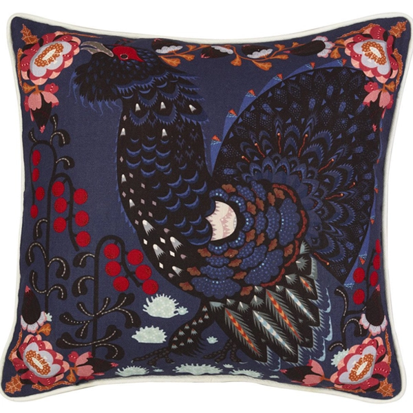 La fodera per cuscino Grouse in the woods di Klaus Haapaniemi rappresenta un bell’esemplare maschio di fagiano con piume nei colori nero, blu e marrone. Lo sfondo è decorato da motivi floreali e bacche rosse. La fodera è realizzata in misto cotone e lino e il motivo è stampato su entrambi i lati.