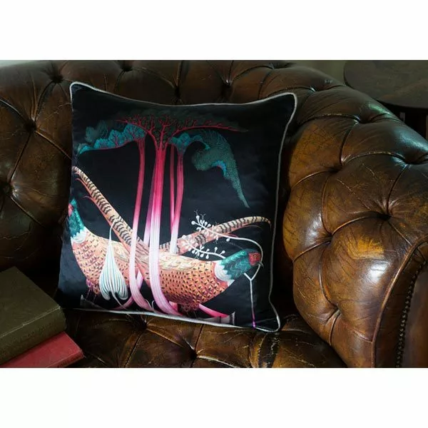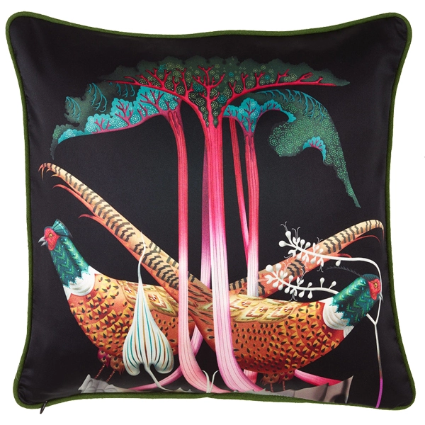 La fodera per cuscino Pheasants and Rhubarb di Klaus Haapaniemi è decorata da un motivo con due bellissimi fagiani e piante di rabarbaro. Il lato decorato di questo cuscino in edizione limitata è realizzato in pura seta e il retro della fodera è in lino color verde muschio. Pheasants and Rhubarb è un delizioso esempio delle illustrazioni di Klaus Haapaniemi, piene di dettagli e colori affascinanti, che non mancherà di arredare con eleganza ogni arredamento e ambiente.