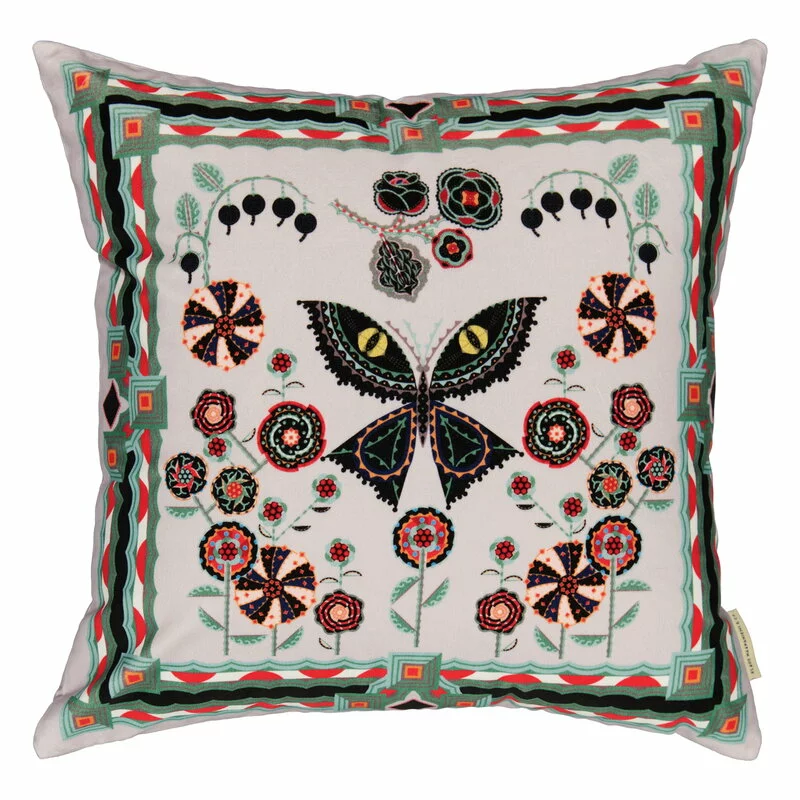 La fodera per cuscino presenta una feroce figura felina dagli occhi gialli, decorata con dettagli ornamentali colorati. Questa fodera per cuscino quadrata è realizzata in morbido velluto di cotone ed è impreziosita da una chiusura a zip nascosta, mentre il retro presenta un motivo floreale con farfalla.