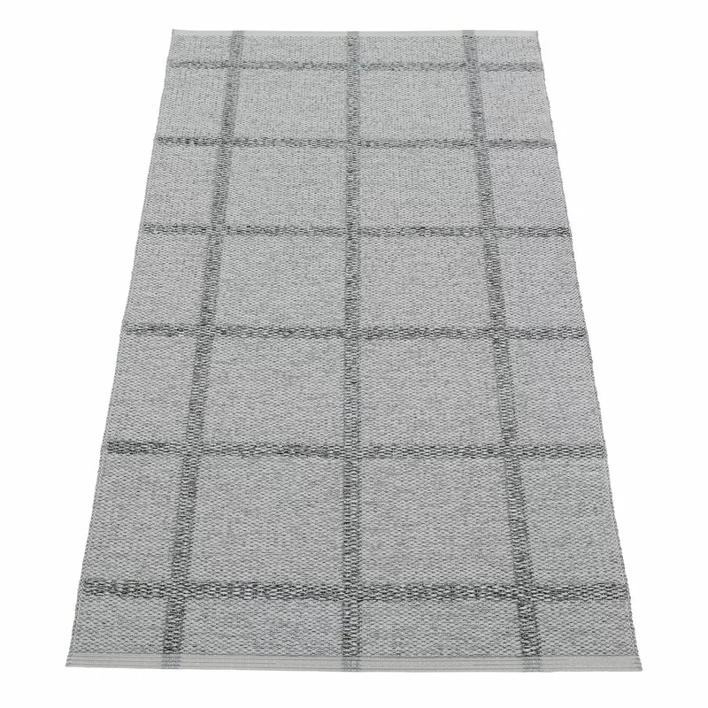 Il tappeto Ada del marchio svedese Pappelina è decorato da un motivo metallico a griglia. I bordi del tappeto sono rinforzati e perciò sono estremamente resistenti.