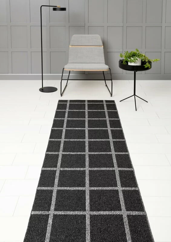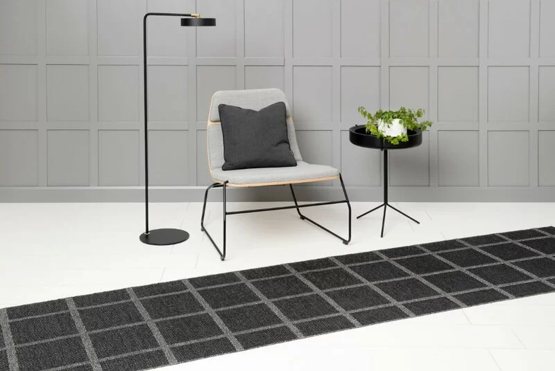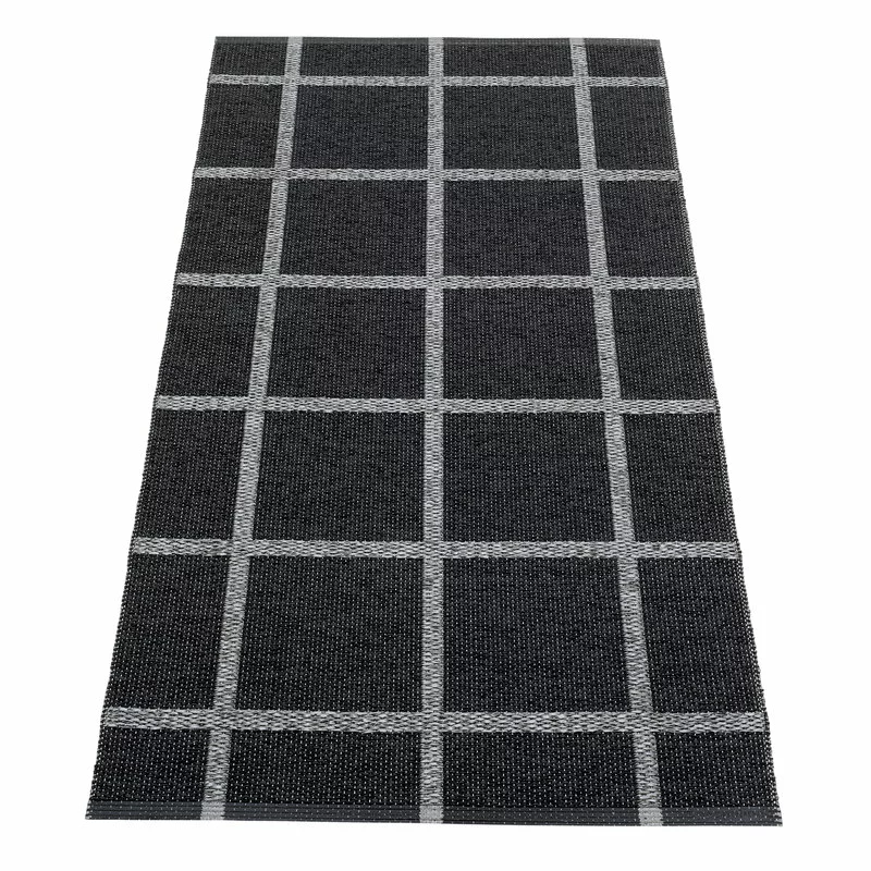 Il tappeto Ada del marchio svedese Pappelina è decorato da un motivo metallico a griglia. I bordi del tappeto sono rinforzati e perciò sono estremamente resistenti.