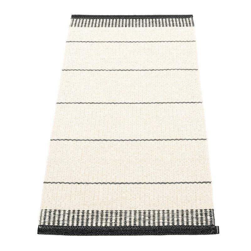 Disegnato dal produttore svedese di tappeti Pappelina, il tappeto Belle è caratterizzato dal contrasto tra uno sfondo chiaro e strisce sottili. I bordi sono piegati due volte e cuciti.