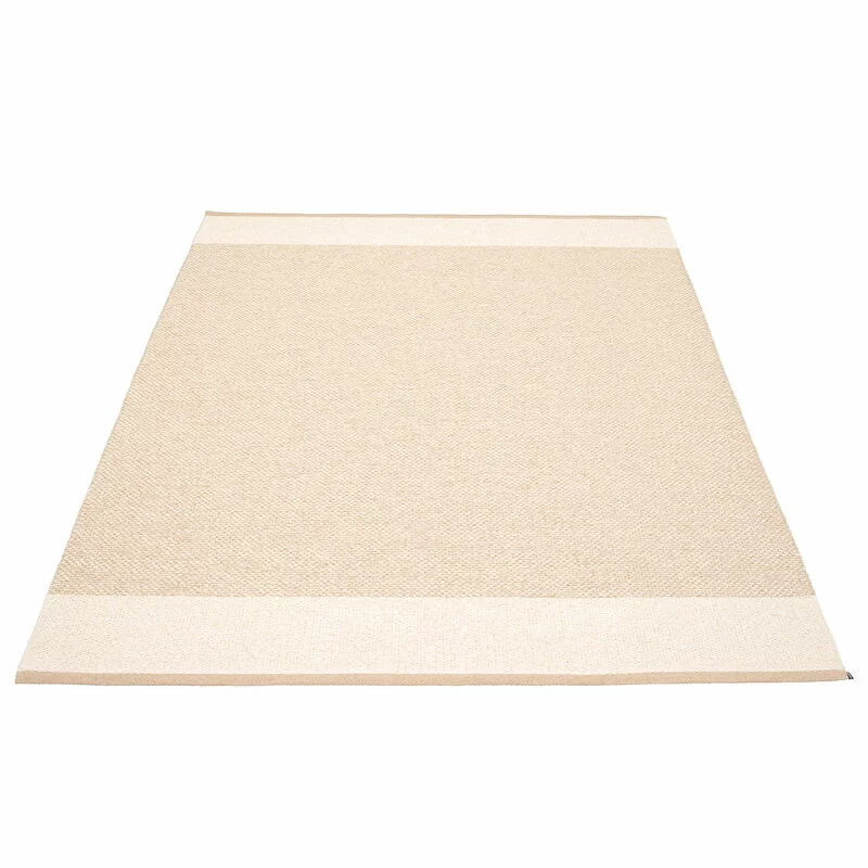 Il tappeto Edit di Pappelina presenta un motivo semplice e senza tempo, tessuto in tre colori che si fondono l’uno con l’altro formando una superficie vivace dalla lucentezza metallica. I bordi, piegati due volte, sono orlati con una robusta cucitura e in un angolo è presente un’etichetta in gomma cucita con il logo Pappelina. Il tappeto Edit può essere lavato a mano o in lavatrice.