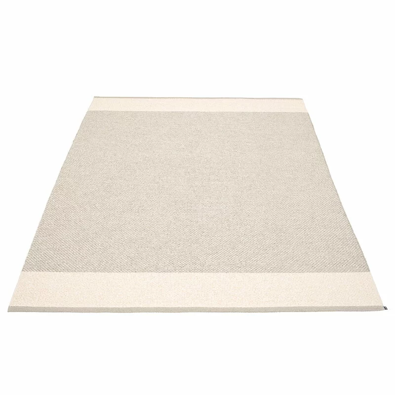 Il tappeto Edit di Pappelina presenta un motivo semplice e senza tempo, tessuto in tre colori che si fondono l’uno con l’altro formando una superficie vivace dalla lucentezza metallica. I bordi, piegati due volte, sono orlati con una robusta cucitura e in un angolo è presente un’etichetta in gomma cucita con il logo Pappelina. Il tappeto Edit può essere lavato a mano o in lavatrice.