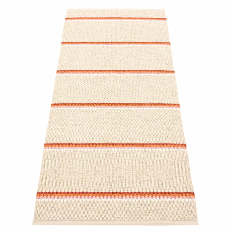 Il tappeto Olle del marchio svedese Pappelina è caratterizzato da uno sfondo con i colori della terra e un motivo a strisce in diversi colori. I bordi sono piegati due volte e cuciti.